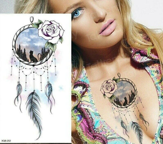 Dream Catcher Tattoo Cat Rose Fake Temporary Tattoos Sticker Womens Feather