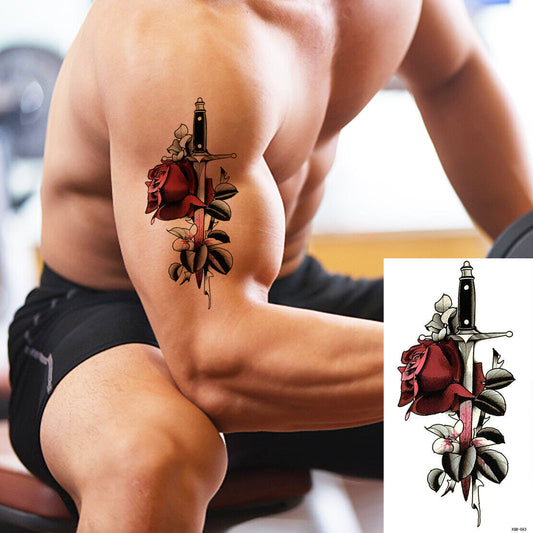 Red Roses Knife Temporary Tattoo Dagger Love Fake Sticker Women Mens Waterproof