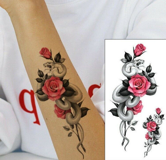 Snake Red Roses Temporary Tattoo Arm Leg Thigh Girls Womens Waterproof Tattoos