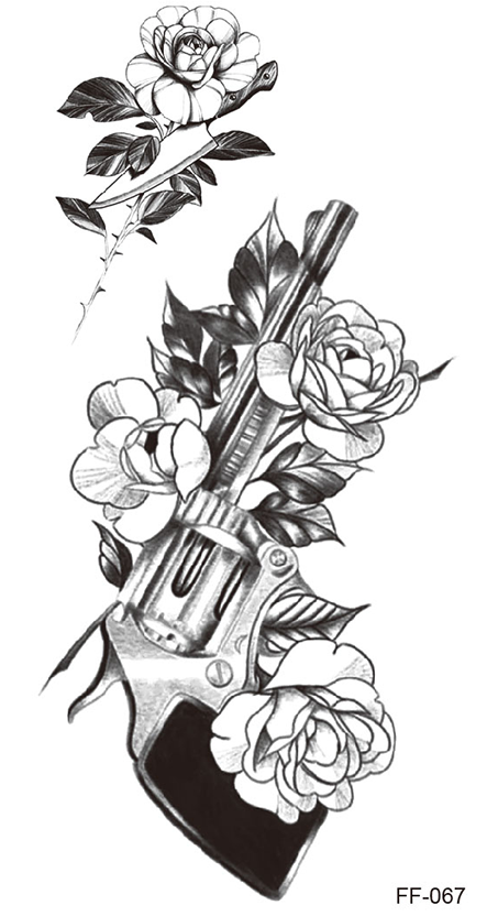 A beautiful tattoo of a gun and single Rose. Perfect to cut up and separate or keep as one tattoo