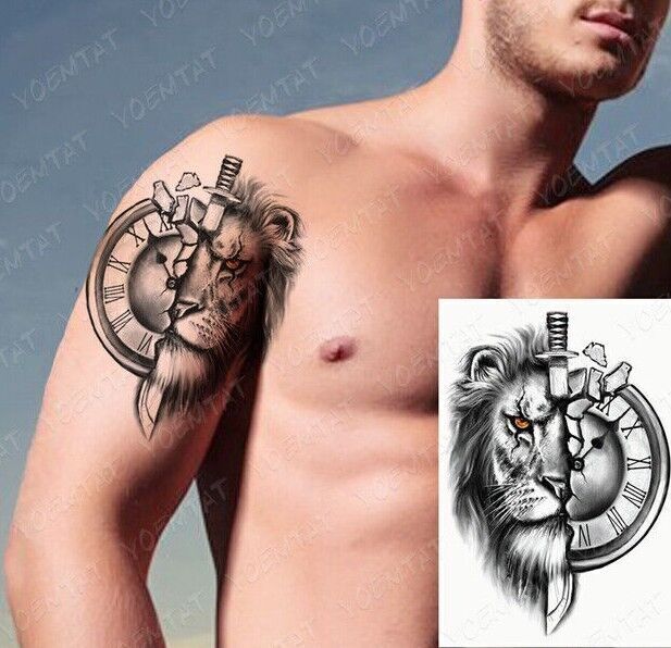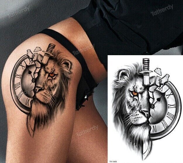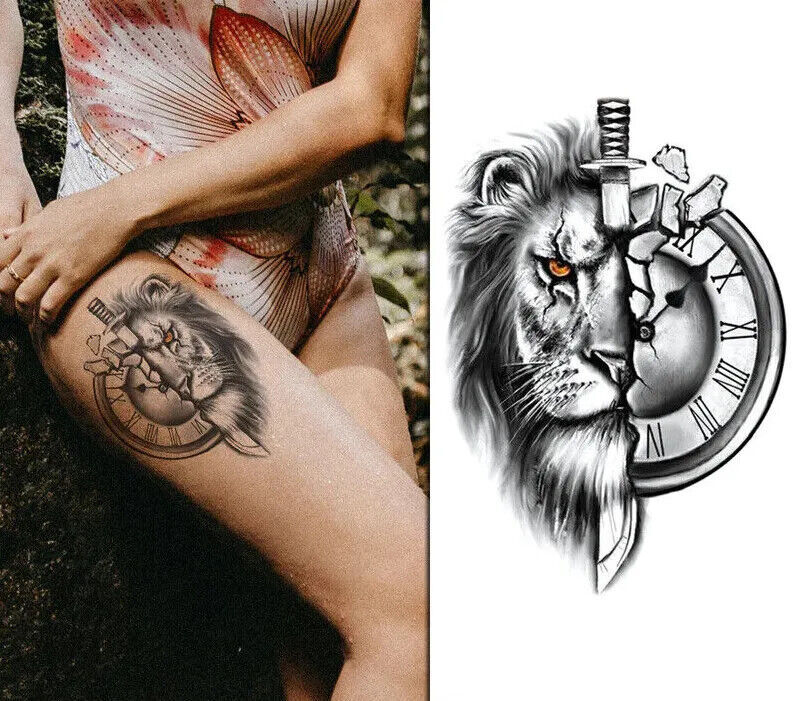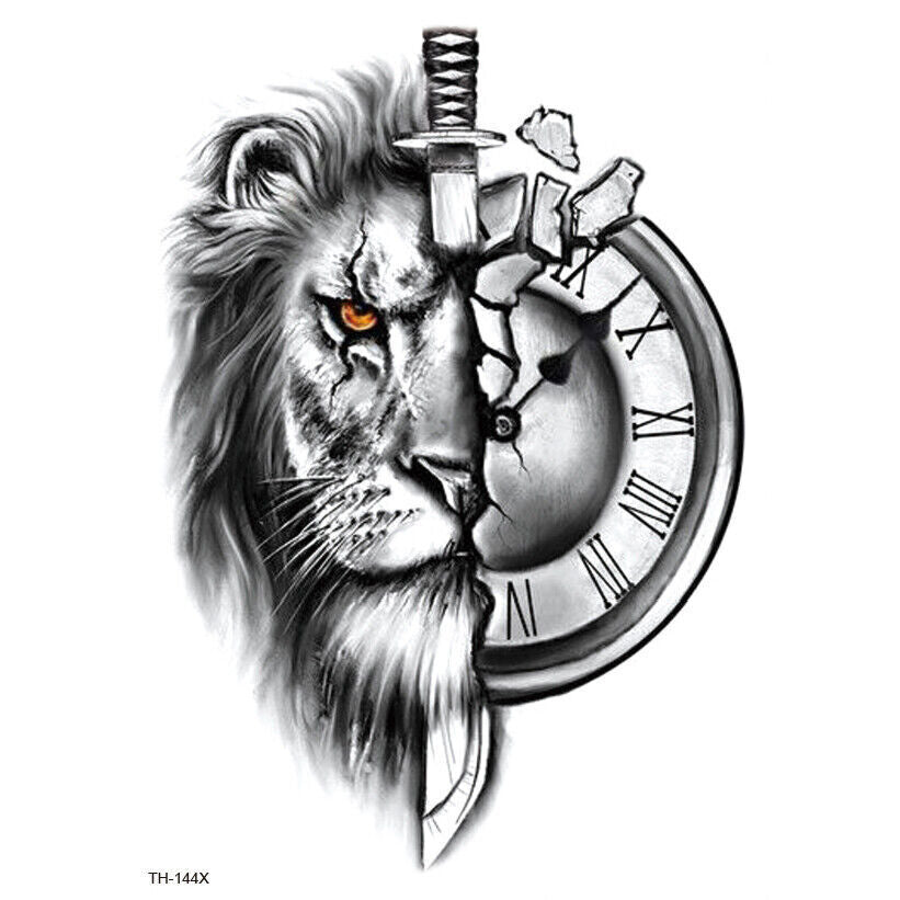 Lion Dagger Clock Waterproof Temporary Tattoo Mens Womens Tattoos Sleeve Knife