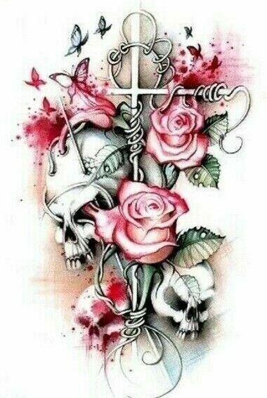Colourful design of pink roses enwinted around a cross and 2 skulls.