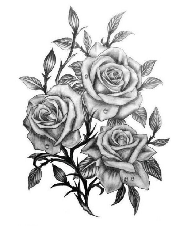 A tattoo design of 3 Grey Detailed Roses grouped together with surrounding thorns & leaves.
