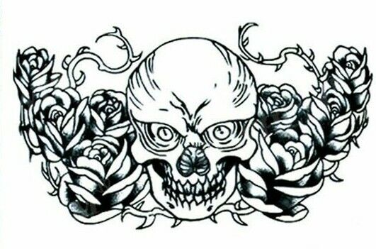 A design of a Skull head with Roses either side, perfect to use as a band on your arm or back or under boob.