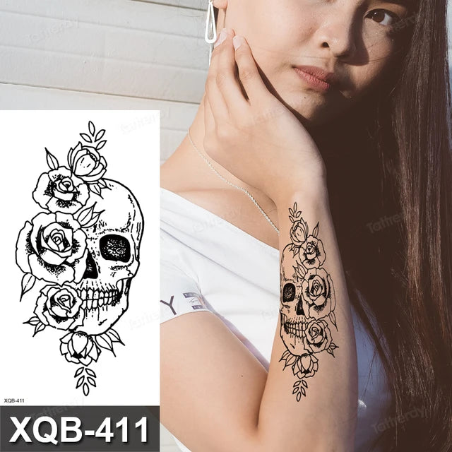 Skull Rose Tattoos Flowers Temporary Tattoo Fake Press Sticker Womens Mens Body